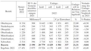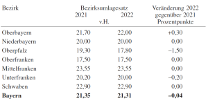 Bei einem Anstieg der Umlagekraft (+6,4 %) sowie des Umlagesolls (+6,2 %) kam es 2022 zu einer durchschnittlichen Verringerung des Bezirksumlagesatzes um 0,04 Prozentpunkte. Zugenommen hat der Bezirksumlagesatz nur in Oberbayern (+0,30 Prozentpunkte). In der Oberpfalz (–1,50 Prozentpunkte) und in Unterfranken (–0,20 Prozentpunkte) konnte er gesenkt werden.